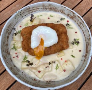Bean and potato stew with Dutch cutlet made of minced pork with Gouda cheese, served with a poached egg and seasoned with dill